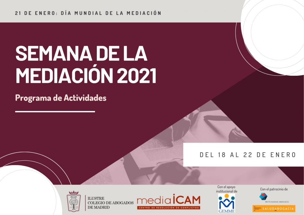 El Colegio de Abogados de Madrid, a través de su Centro de Resolución de Conflictos – mediaICAM, celebrará entre el 18 y el 22 de enero la Semana de la Mediación con la programación de una serie de eventos y actividades que tendrán lugar de forma telemática y estarán dirigidas a todos aquellos profesionales que estén interesados en conocer y ampliar información sobre la mediación como método adecuado para prevenir, resolver o minimizar conflictos.