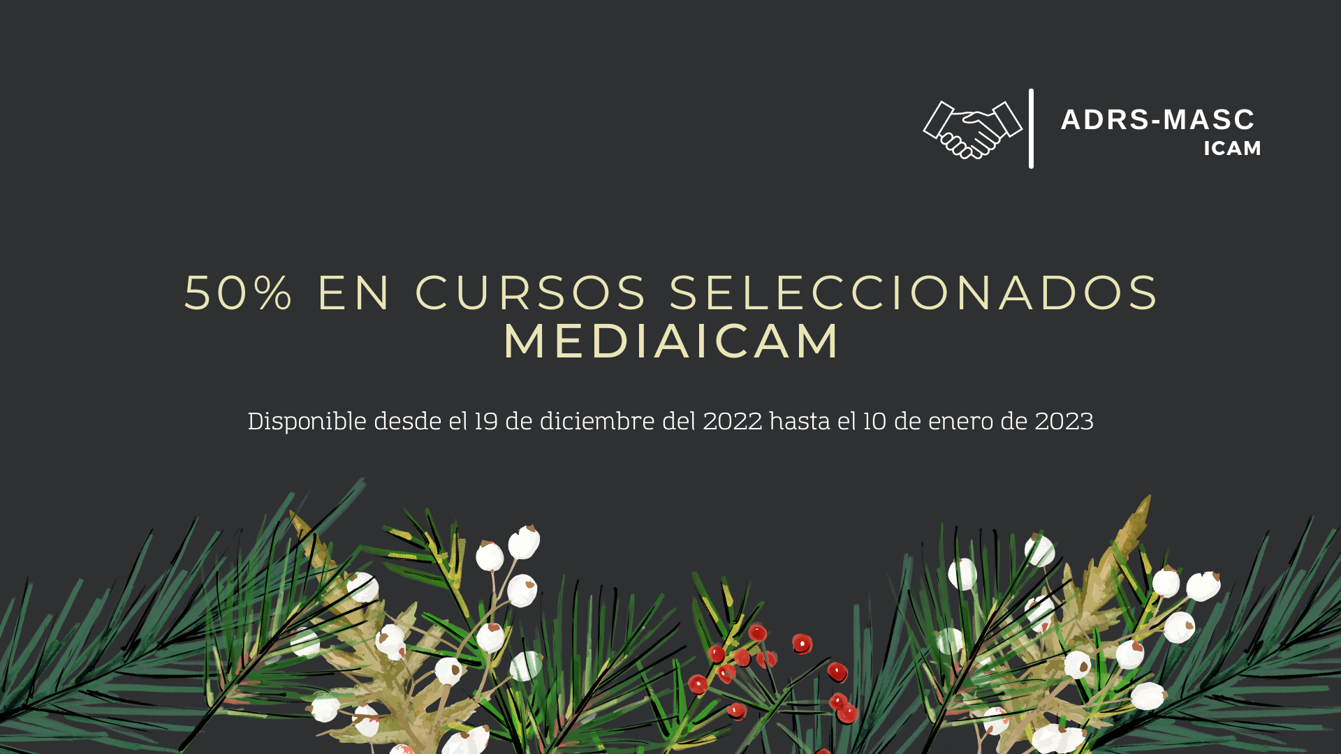 El Centro de Resolución de Conflictos del Colegio, mediaICAM, pone en marcha una nueva campaña navideña ofreciendo a los colegiados y colegiadas un descuento del 50% en la inscripción de una selección de cursos en materia de ADRs-MASC.